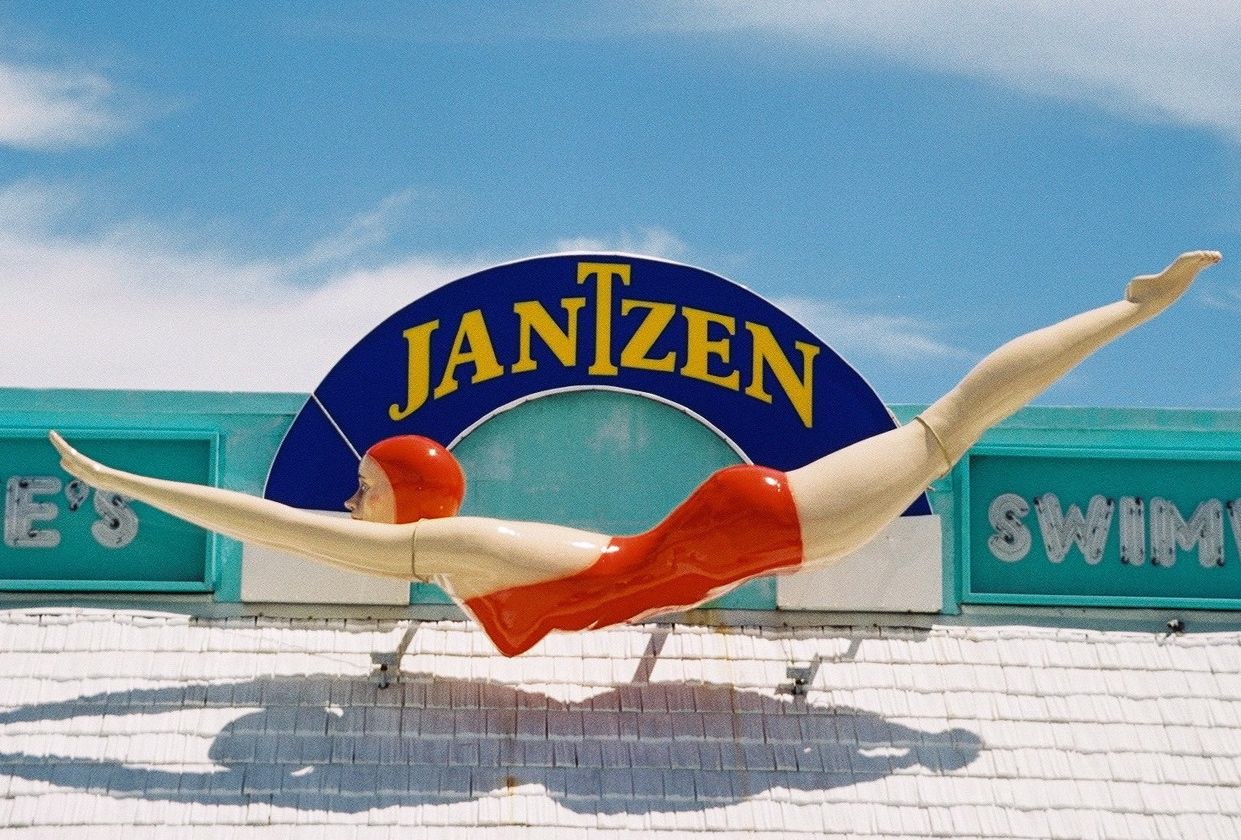 In a saucy suit resembling a long tank top, the Diving Girl became something of a craze. In 1922, Jantzen printed 10,000 Red Diving Girl stickers that were distributed in store displays, which people grabbed up to paste on the windshields of their cars. Massachu- setts banned the decals from auto windshields.